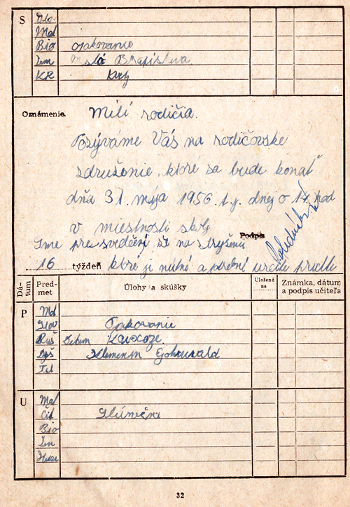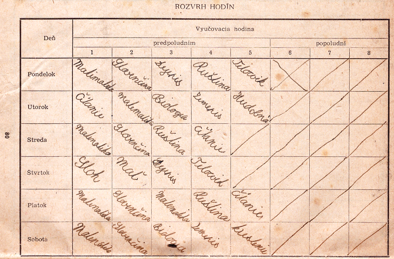 Žiacka knižka a rozvrh Mariána Prívozníka z V. ročníka 8-ročnej školy v Šúrovciach v školskom roku 1956-1957