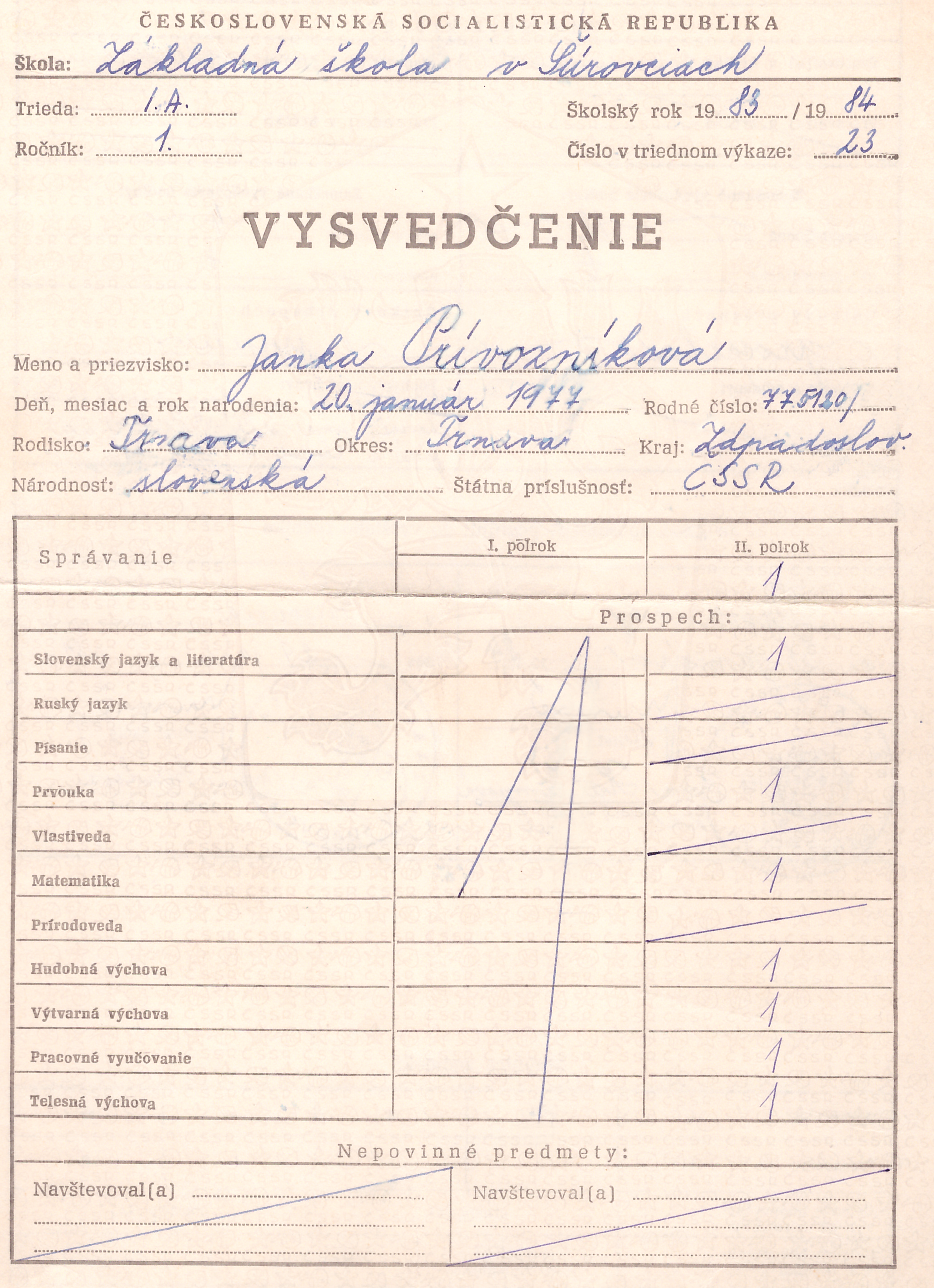 Prvácke vysvedčenie Janky Prívozníkovej, dcéry Mariána Prívozníka, zo školského roku 1983/1984