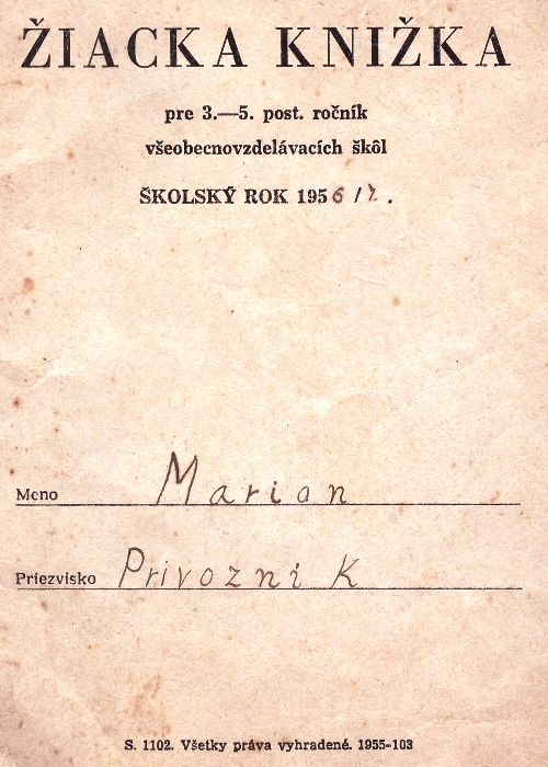 Žiacka knižka a rozvrh Mariána Prívozníka z V. ročníka 8-ročnej školy v Šúrovciach v školskom roku 1956-1957