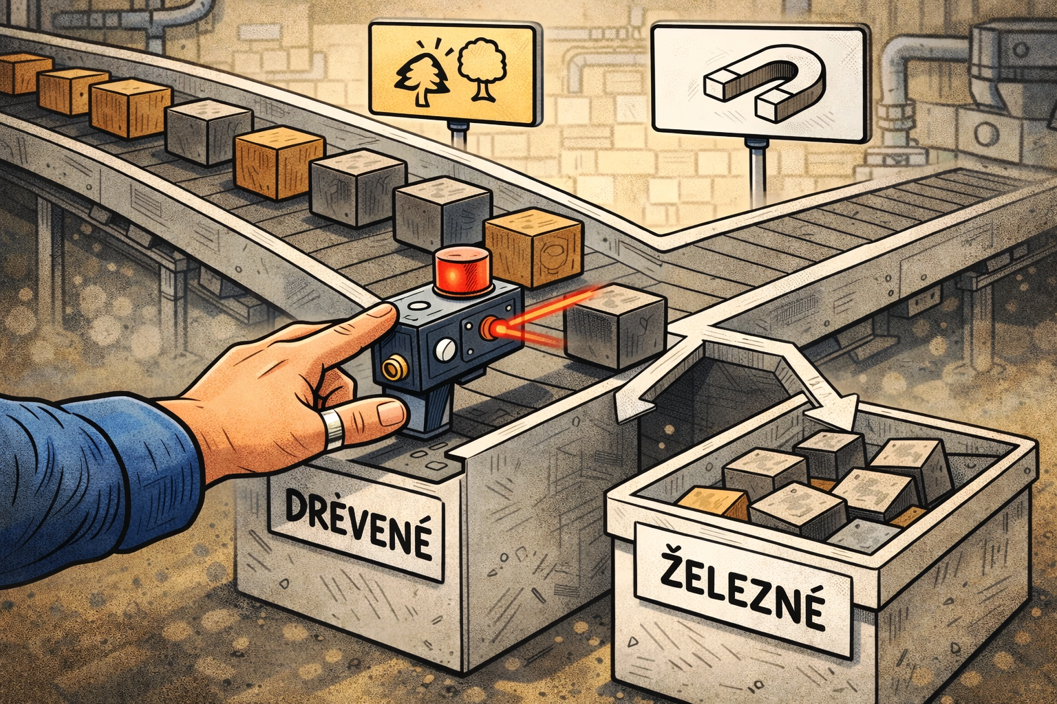 „Ako pokaziť výrobný proces na automatickej linke, kde sa používa indukčný snímač na roztriedenie železných a drevených kociek?“